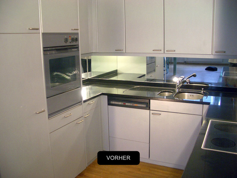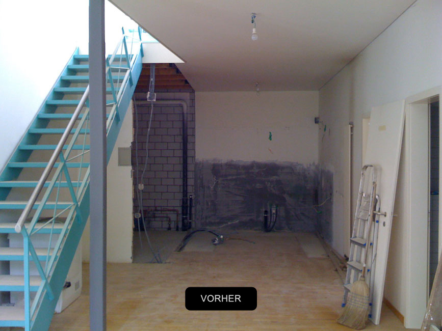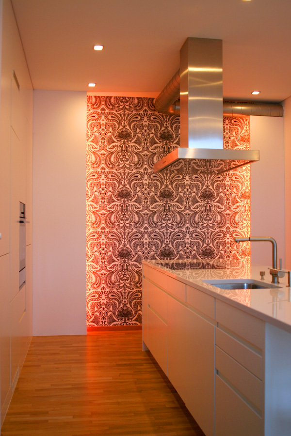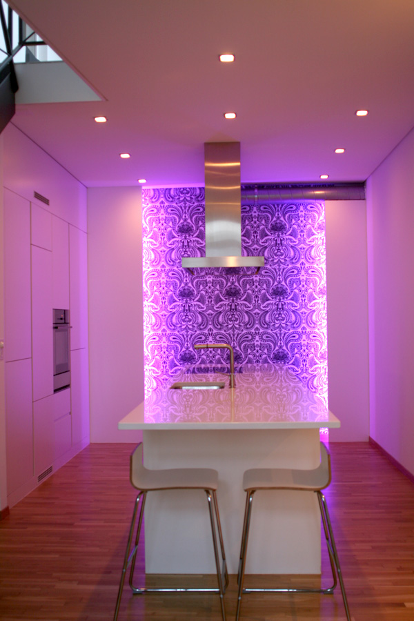 Neugestaltung der Küche in einer Loft. Die alte, graue Küche wird ersetzt mit einer hell gestalteten Küche. Akzente mit hochwertiger Tapete und integrierter LED-Beleuchtung, die für individuelle Farbstimmung sorgt.