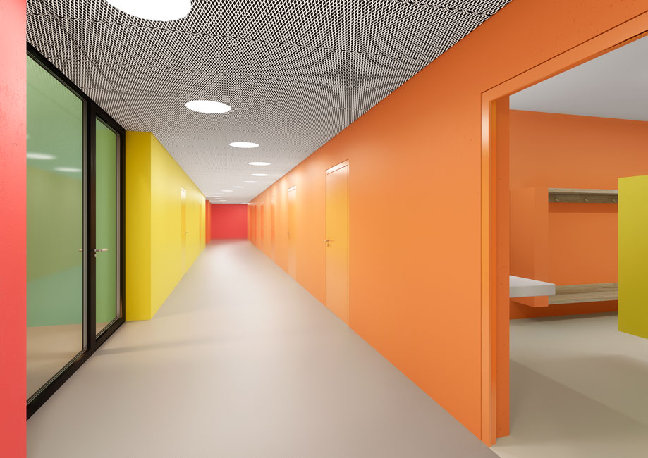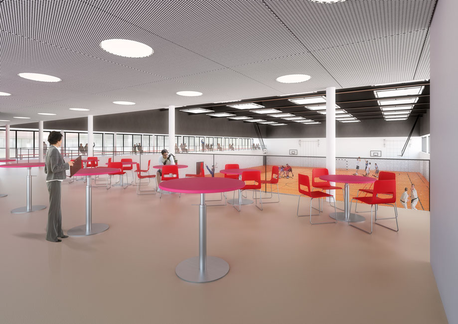 Das Konzept umfasst die Aussenfassade, Foyer, Sporthalle, Korridore, Kabinen, Küche, etc.