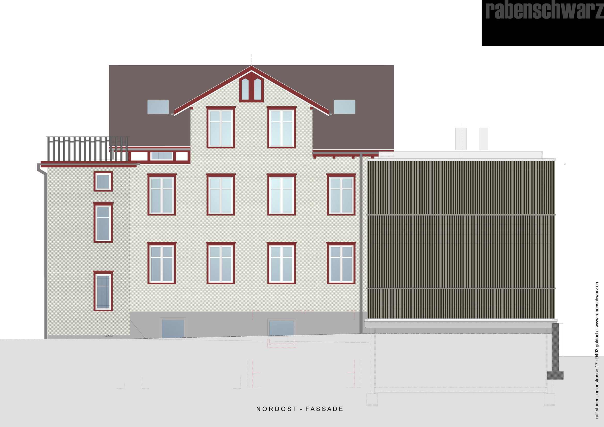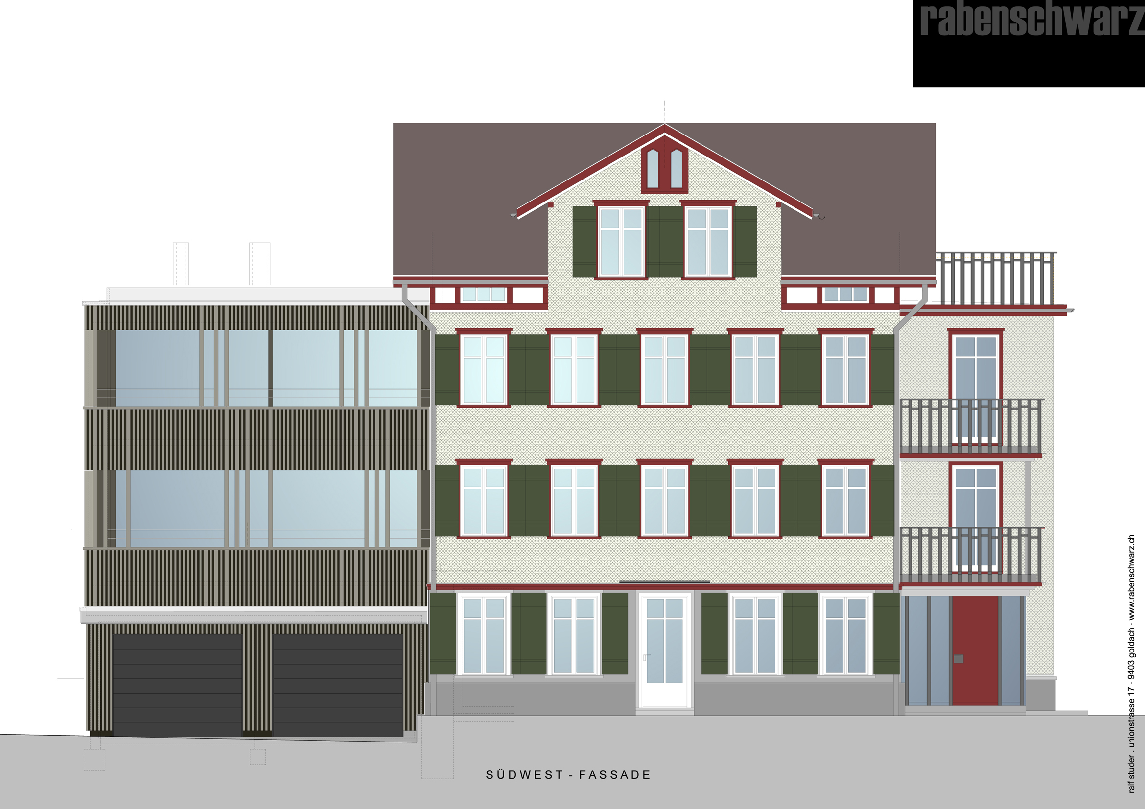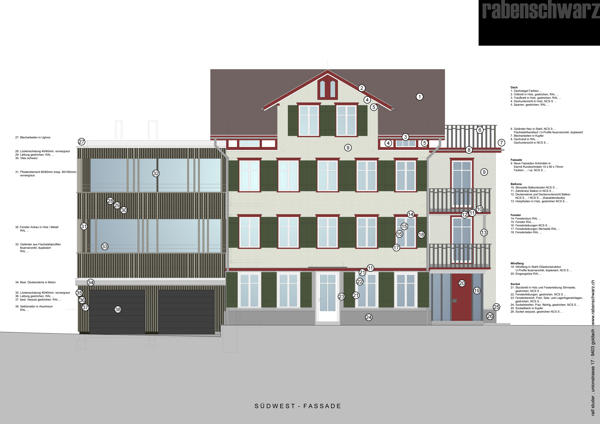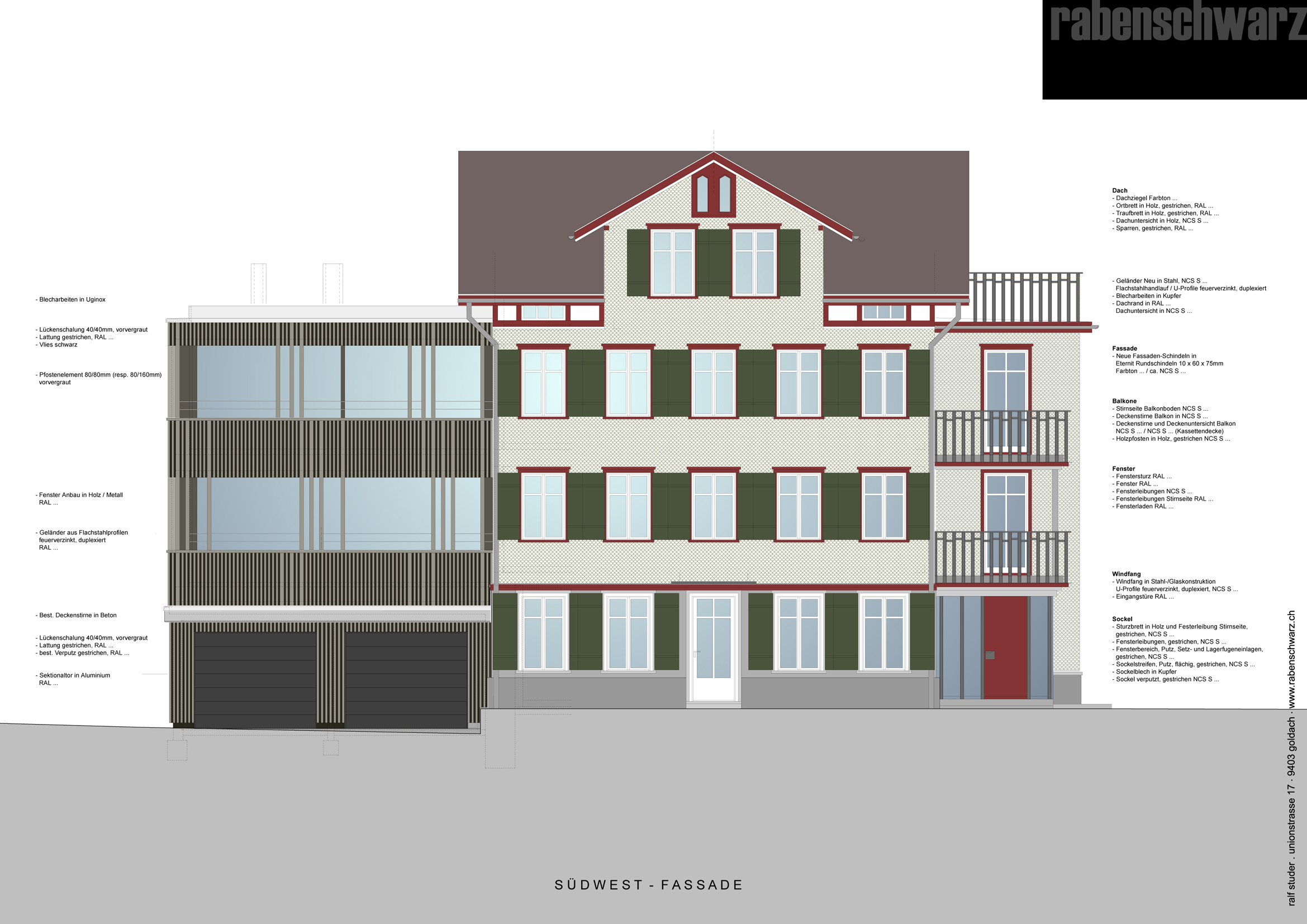 Architektur Archplan St.Gallen I Farb- und Materialkonzept rabenschwarz. Das Farb- und Materialkonzept umfasst die Fassade, Treppenhaus und Wohnungen.